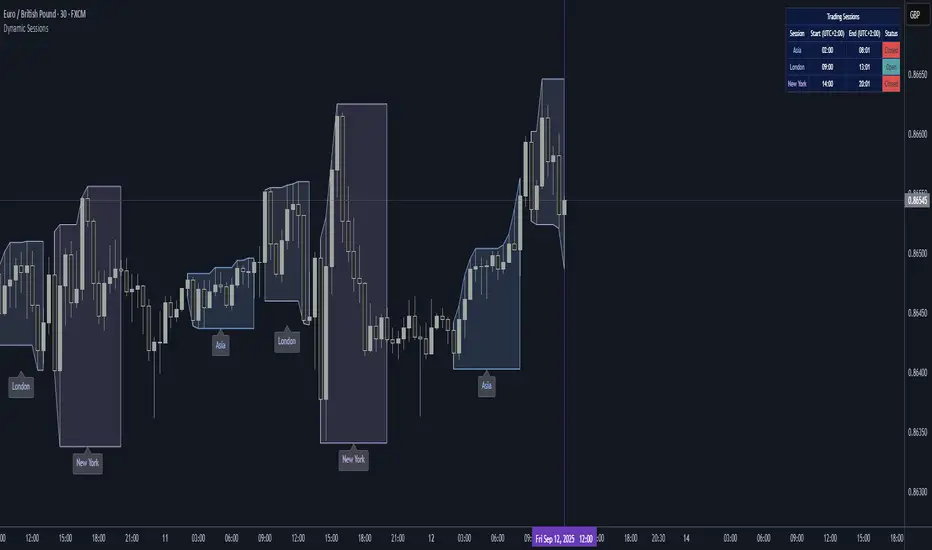 This indicator lets you set trading sessions (custom sessions) and print them out as dynamic polyboxes instead of traditional rectangles which lets you identify strong moves and trends easier.