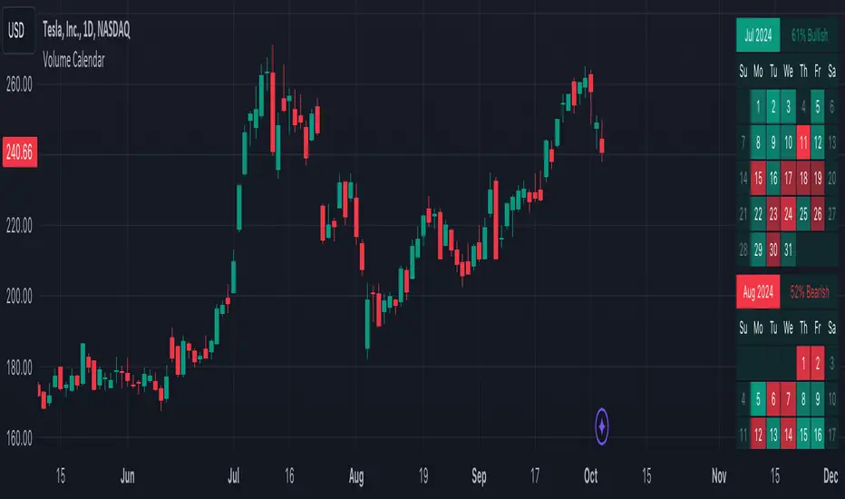 The indicator displays a calendar with Volume data for up to 6 last months. It is designed to work on any timeframe, but works best on Daily and below. It is also consistent in that it displays the same data even if you go to lower timeframes like 5 minutes (even though the data is used is Daily).