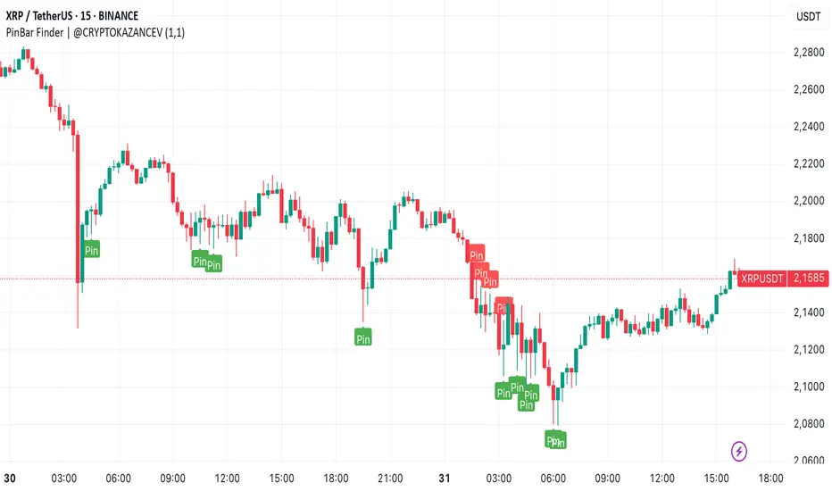 PinBar Finder | cryptokazancevThis script helps traders identify high-probability reversal points based on price action, specifically Pin Bars — a well-known candlestick pattern used in technical analysis.