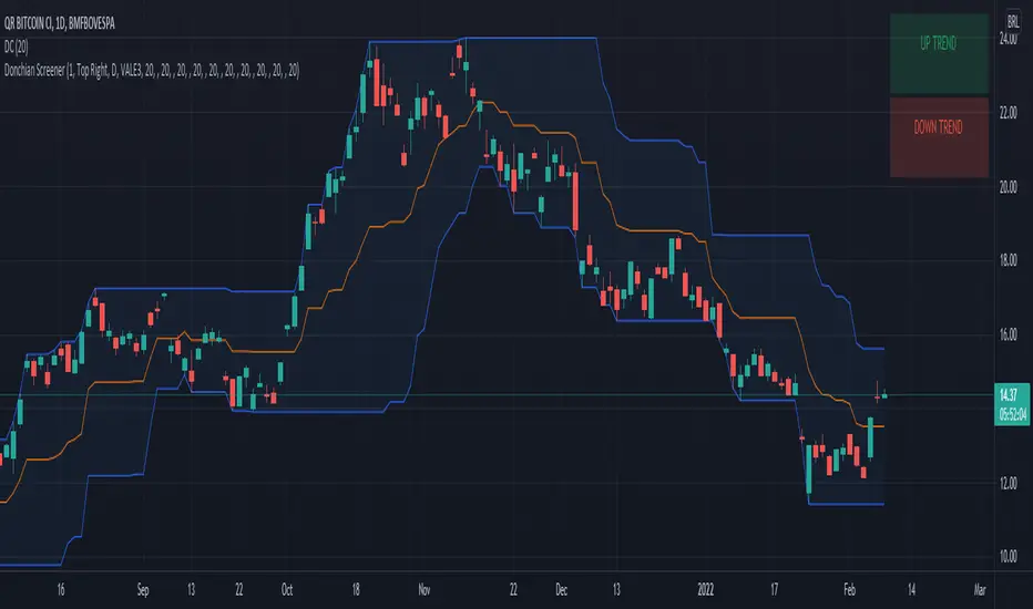 This is a screener script for the Donchian Channel indicator. It's an excellent indicator for trend following, a trading strategy which tries to take advantage of long, medium or short-term moves that seem to play out in various markets.