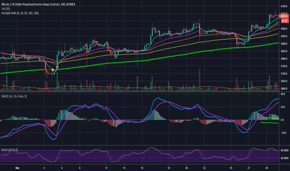 Multiple EMA lines. Color switch of slowest EMA (def=200) when price close above or below. Trend marker when fastest EMA (def=9) cross slowest one.