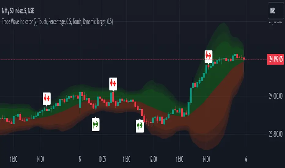 Trade Wave is a momentum-based indicator designed to show reversal signals. Most of the time, markets are in range bound and this indicator tries to show you the overbought and oversold zone of the time frame you select. It works well during range bound market giving you reversal signals at highs and lows of the range. One can make use of "Momentum tuning" in inputs section to pick the level of momentum aggressiveness. If value is higher, signals will be lesser and if value is low signals will be more. One can also choose different types of stop-losses and targets.