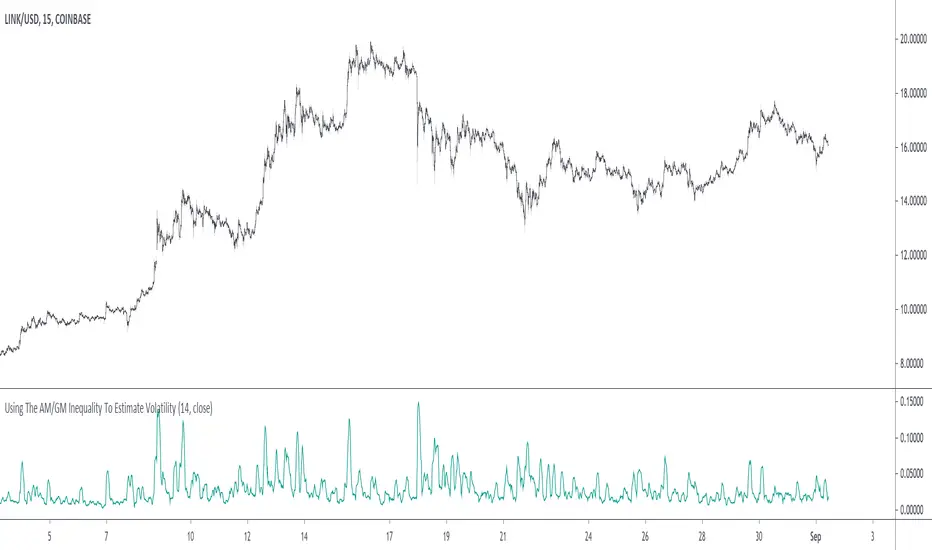 A volatility indicator derived from the AM/GM inequality. I don't think it will be necessary to describe the usage and interpretation of such indicator, and I don't think it is super useful, however, this is not the case of the script, which contains three ways to compute the geometric mean, with a classic, a simple, and an efficient way. The AM/GM inequality is also a really interesting concept, and I'll try to"prove" it in this post by using DSP. I also added more comments in the script in order to highlight some stuff.