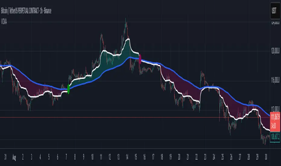 VCMA (Volumetric Compressed Moving Average)uses the compressor and weighted standard deviation functions originally translated to pinescript by gorx1 to plot moving averages in order to use for entry confirmation.