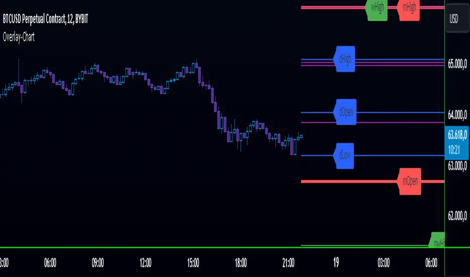 The Overlay-Chart Indicator is an advanced script designed for scalpers and day traders, providing comprehensive insights into daily, weekly, monthly, and previous period price levels. This indicator helps traders visualize critical price levels and make informed decisions based on historical and current data.