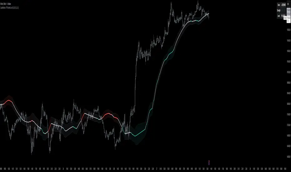 The indicator expands the main line into upper and lower zones based on ATR and trend strength, creating a dynamic volatility envelope around the trend structure.