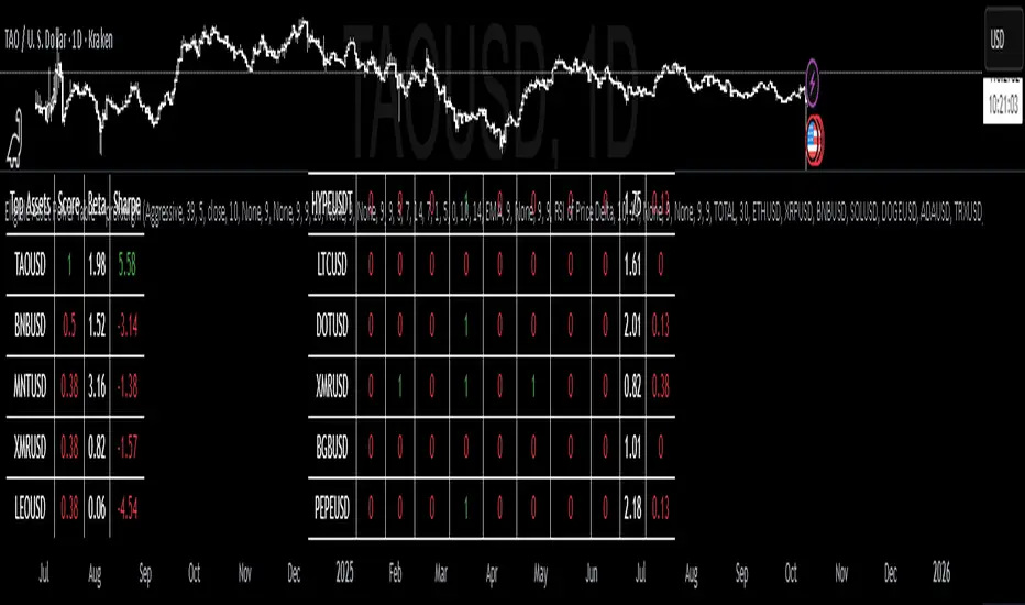 The Eligible Asset Power Table is a multi-asset screening dashboard that assesses cryptocurrency portfolios across multiple momentum, risk, and relative metrics to generate eligibility scores. It combines RSI variants, rate of change layers, Sharpe ratios, momentum RSI, price delta analysis, and beta exposure to rank assets, helping traders identify high-conviction opportunities through dual-mode scoring and visual tables.