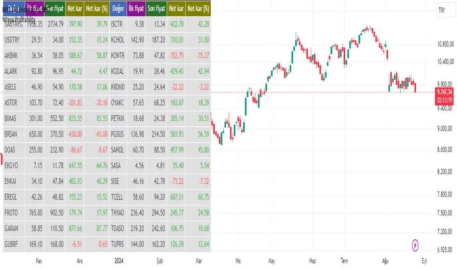 Niteya BG Profitability, 32 adet hissenin belirli bir tarih aralığındaki ilk ve son fiyatını, net kar miktarı ve yüzdesini gösteren bir indikatördür.