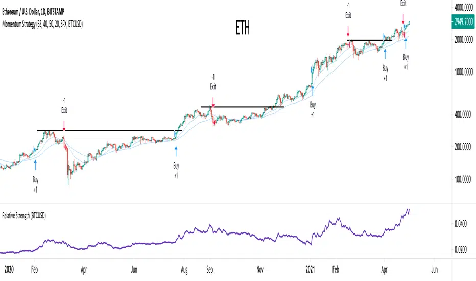 This strategy uses momentum to determine when to enter and exit positions. The default settings are set to look for a new 63 day high (~1 trading quarter) and a new 40 day relative high. If the stock is trending above the 50 day moving average it is a candidate to be bought. Stops are triggered when price closes below the 20 day or 50 day EMAs depending on how well the stock is trending. A stop could also be triggered even if price continues to move up, but is breaking down on a relative basis to a benchmark either SPX or BTCUSD . The goal is to hold on to our winners for as long as possible and cut the losers as soon as possible. This will alow us to capture the majority of major trends while avoiding many large drawdown and relative losers.