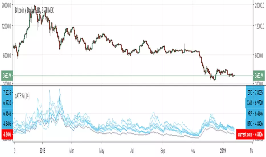 Comparison of the ATR (Average Trading Range) of multiple coins. The ATRs are shown as percentage.