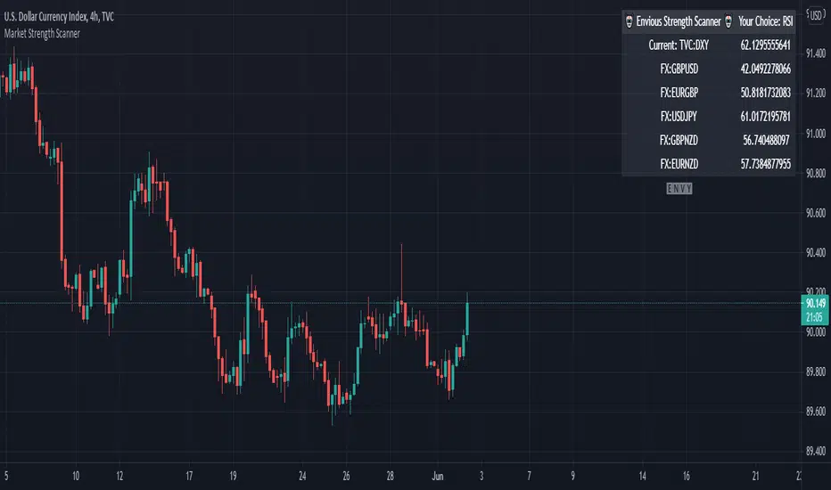 Hey traders, this is a table-based market relative strength and true strength scanner, designed to allow the users to get data from multiple pairs without having to go onto that pair for their strength's. This indicator uses functions to fetch data from other pairs so that the code is optimised and prevents slow loading. Furthermore, the indicator is easy to understand and use as there isn't a lot of settings for it, you can adjust the length of the true strength index or the relative strength index through one input box, you can change the data type from RSI to TSI without changing the code, and you can customise what pairs you want to display. Furthermore, the user can set alerts for the pairs that they want to have such as setting alerts for overbought and oversold zones. That's all to this indicator and I hope it is of use to some people :)