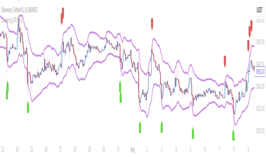There are two bands calculated with the ATR and I added "Smoothing" into the script.