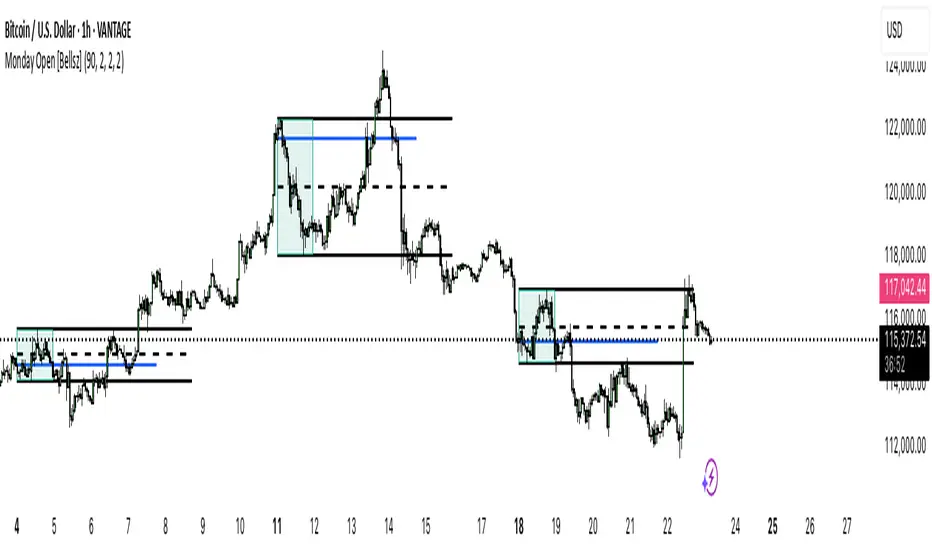 - When Monday ends, the script freezes the range and plots final H/L/EQ + Open, extending each by your chosen number of bars.