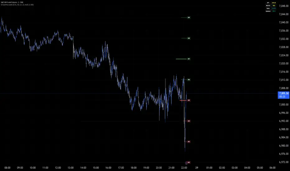 This indicator displays gamma exposure levels from SPY options data, automatically scaled to ES/MES futures prices. Simply copy gamma data from your dashboard and paste it into the indicator to see key support and resistance levels based on dealer positioning.