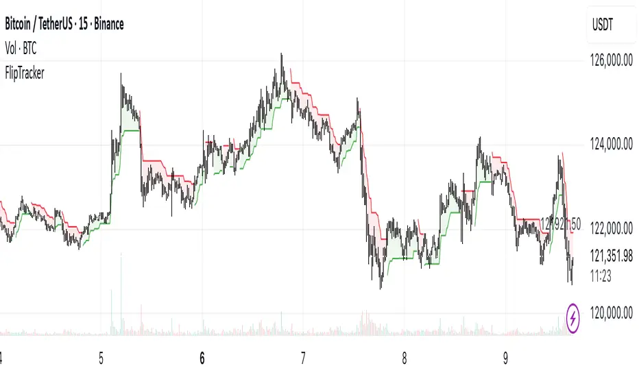 When the direction flips (price crossing the FlipTracker), the indicator changes color and provides a potential trend reversal signal.