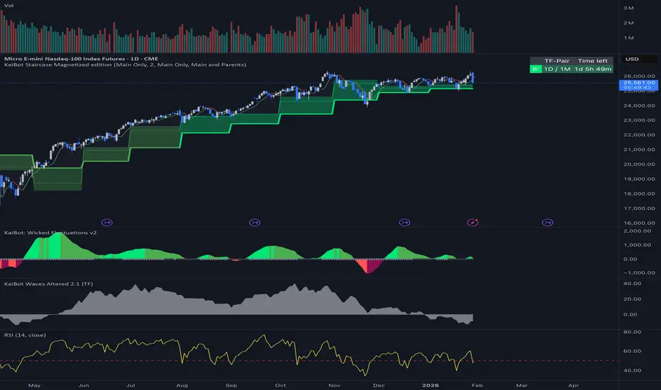 The KaiBot Staircase is a multi-timeframe trend analysis indicator that visualizes hierarchical price levels across different timeframes, creating a "staircase" effect. It helps traders identify confluence zones where multiple timeframe trends align and detect momentum shifts through dynamic color coding.