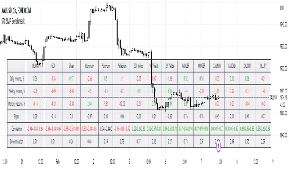 The indicator is plotting a table with the current performance of the particular group, for example the metal sector and all correlated Gold pairs. The table is showing the performance of the pairs based on monthly, weekly and daily bases in the same time. In this case the trader can track all pairs simultaneously and see if there are anomalies between the pairs - SMT Divergence.