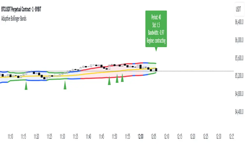 This indicator displays Bollinger Bands with parameters that dynamically adjust based on market volatility. Unlike standard Bollinger Bands with fixed parameters, this version adaptively modifies both the period and standard deviation multiplier in real-time based on measured market conditions.