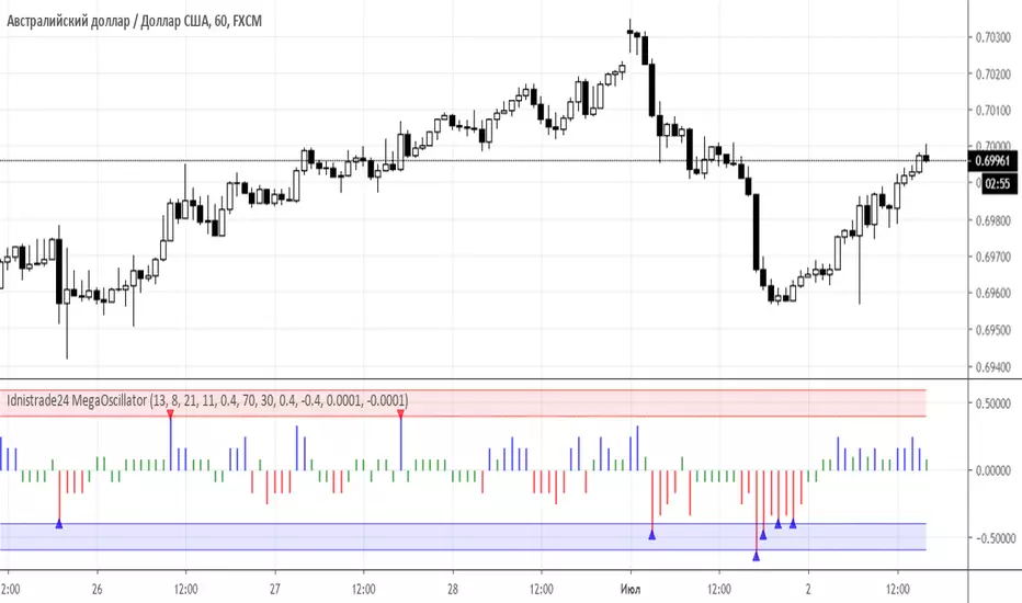 “Idnistrade24 MegaOscillator” indicator is a symbiosis of such techniques as autoregression analysis, range trading, RSI, ROC, MACD, which results in obtaining the integral value of the current overbought/oversold level in the market.