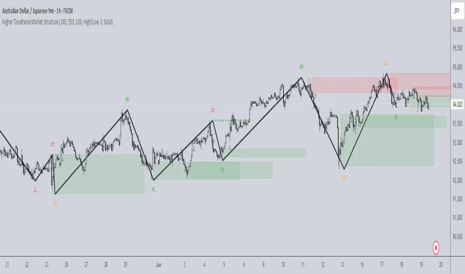 This powerful indicator is designed to identify higher-timeframe market structure using a combination of ZigZag patterns, Break of Structure (BOS) signals, and Supply/Demand zones.