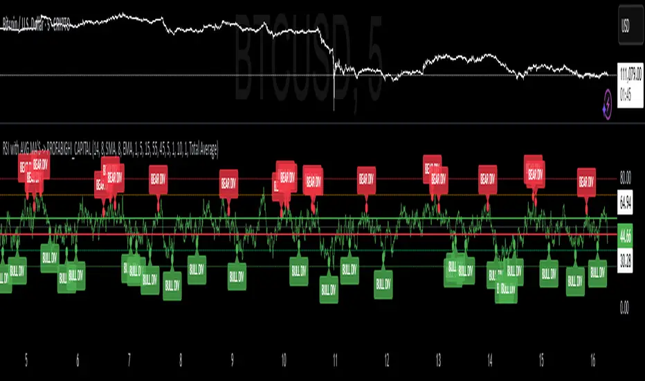 The RSI with AVG MAs → PROFABIGHI_CAPITAL indicator enhances traditional RSI analysis by layering moving averages across multiple timeframes, providing smoothed momentum signals and divergence detection for spotting overbought/oversold conditions and potential reversals. It allows traders to focus on averaged RSI values or individual components for clearer entry cues in trending or ranging markets.