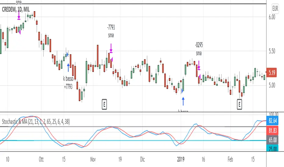 EXIT CONDITIONS: once the entry has "gone well", we follow the upward trend of the stock not with a stochastic oscillator - which tends to exit too soon, especially in case of strong trends - but with a simple moving average exponential (by default at 38 periods). Also in this case a filter is added, that is, k must be> to a filter threshold (recommended = 65) which is used to distinguish the decline between a "physiological" tracking. "(k drops" slowly "together with the approach of prices to the moving average) from a more" violent "tracking (prices are below the moving average and k consequently fall" suddenly ", in a few bars).