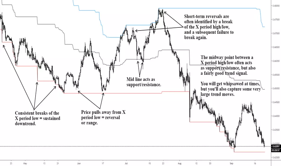 Also, the mid point between an X period high/low is often a good trend-follower, as well as acting as support/resistance . I encourage you to experiment with different ways of using this indicator. Entire systems (if your risk management is correct) can be built and traded from this one indicator.