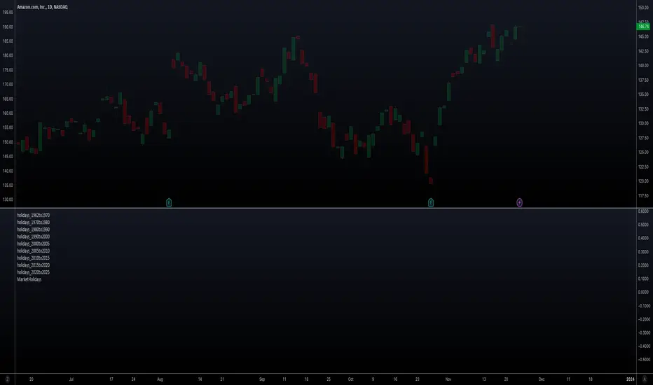 This dataset is part of my "MarketHolidays" library. The datasets were split into different libraries to overcome compiling limitations, streamline the process of removing specific time frames if not needed, and to enhance code execution speed. The timestamps are generated using a custom Python script that employs the 'pandas_market_calendars' library. To build your own set of arrays, you can find the script and instructions at github.com/Labiri/PineScript-Market-Holidays/.