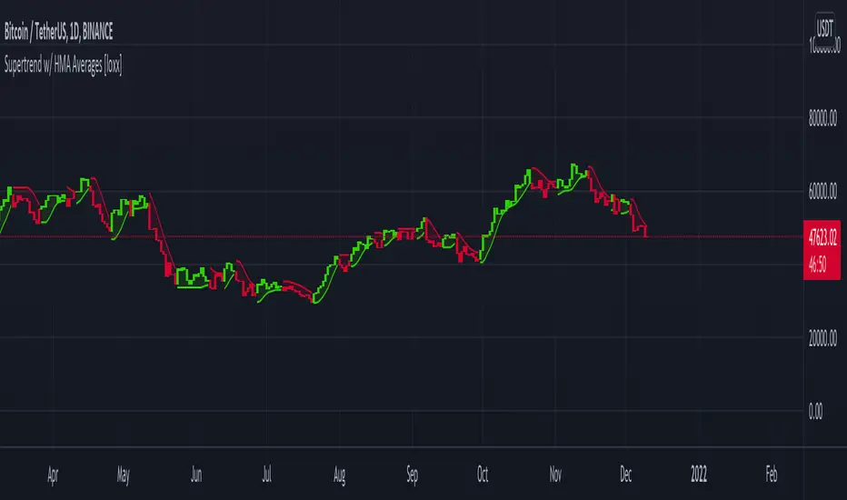 The Supertrend w/ HMA Averages Indicator is a trend following indicator which is based on the concept of using the ATR as a basis for identifying trend direction. It is a modification of the classic Supertrend Indicator, which instead of plotting a line based on price action, it plots a line based on a short-term moving average line. This indicator is preset to use the HMA with length 12, also using ohlc4 as the price point used for the calculation. It is also preset to use an ATR of 12 periods and an ATR multiplier of 0.66.