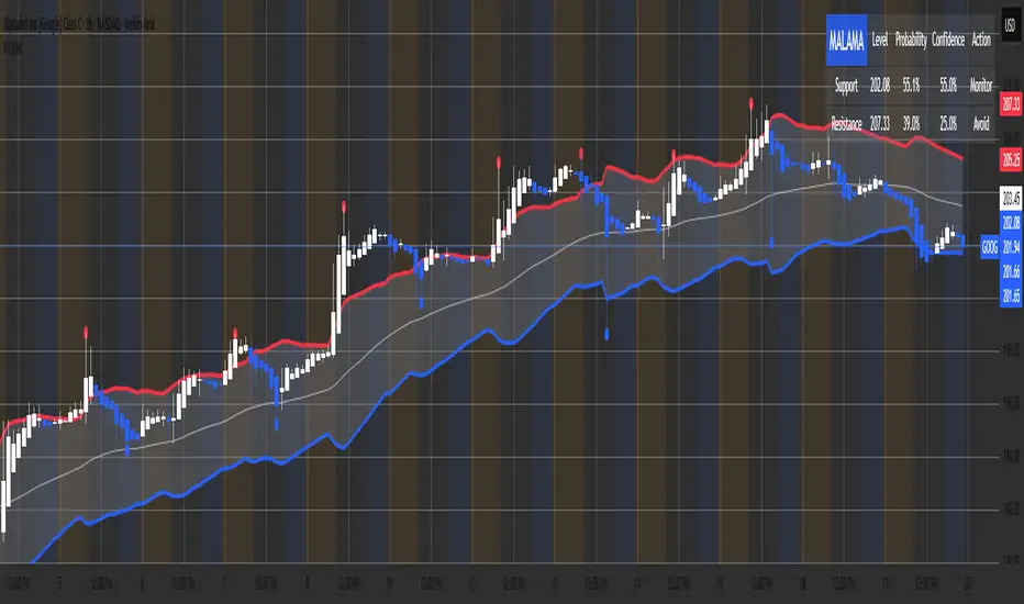 Malama's Quantum Swing Modulator (MQSM) is an overlay indicator inspired by quantum mechanics principles to analyze swing structures and potential reversal zones. It identifies key support and resistance levels from recent pivots, then assigns probability and confidence scores for trading actions like buying dips near support or selling rallies near resistance. By blending momentum oscillators, volume dynamics, and market regime detection, it helps swing traders gauge when price is "entangled" in high-conviction setups versus uncertain ranges. This version corrects logical flaws from prior iterations, adds runtime safeguards, and enhances input flexibility for more reliable signals across assets like stocks, forex, or crypto.Core Mechanics