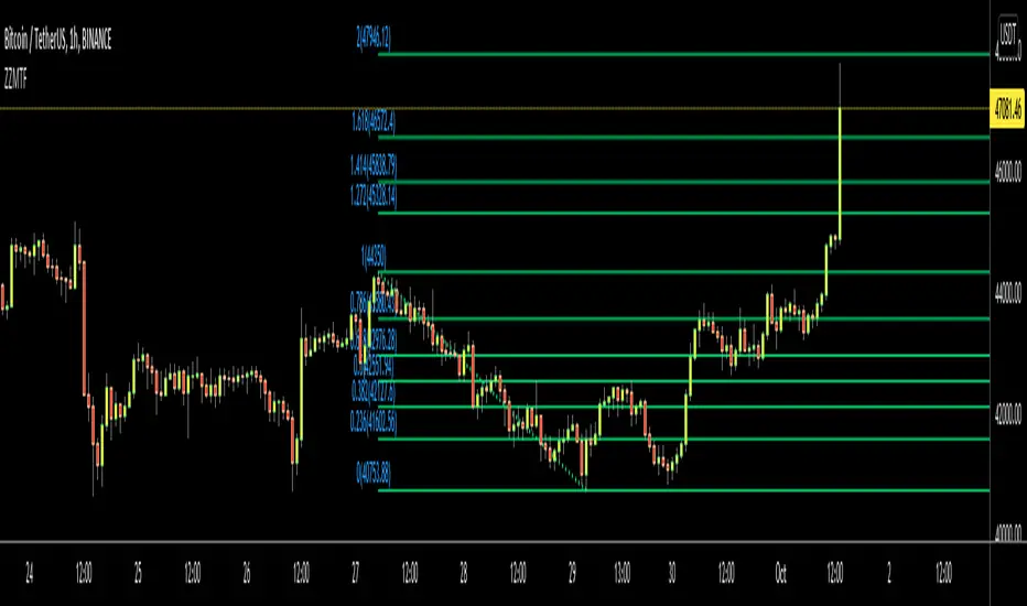 This is ZigZag Multi Time Frame with Fibonacci Retracement script. It calculates the ZigZag using Higher Time Frame, draw Fibonacci Retracement lines and put labels accordingly. I already published Zigzag with Fibonacci Levels script but this one is Multi Time Frame and I didn't want to change/update it.