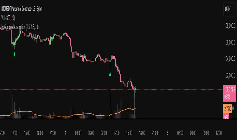 It analyzes candle structure and volume to detect possible bullish and bearish absorption events, providing a visual cue for traders studying market imbalance and liquidity dynamics.