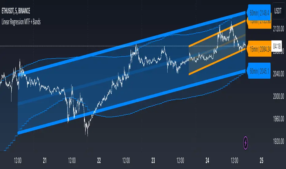- Linear Regression Bands: For each time frame, the indicator calculates linear regression bands. These bands represent the expected price range based on past prices. The middle line is the linear regression line, and the upper and lower lines are set at a specified deviation from this line. Traders can use these bands to spot potential overbought or oversold conditions, or to anticipate future price movements.