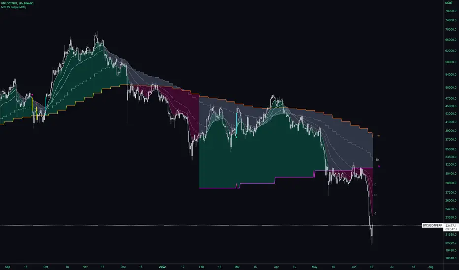 For example, if BTCUSDT closes above the 'D' plot of the guppy, it will be closing above the 50 midline of the RSI on a daily time frame.