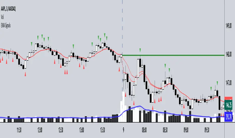 This allows for one EMA to reference the regular session well the other references the extended session. A green arrow will appear above a bear candle closing above both the EMAs and a Red arrow on bull candles closing below both.
