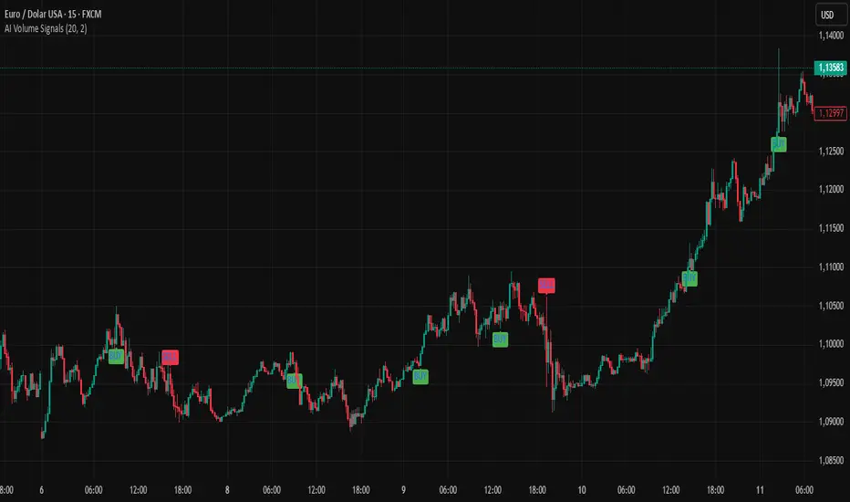 The AI Volume Signals indicator detects significant volume spikes and combines them with trend direction and candle color to generate buy and sell signals. This script utilizes an Exponential Moving Average (EMA) of volume to detect abnormal volume spikes, which could indicate strong market activity. It also filters signals based on the trend direction determined by a 50-period EMA of the price.