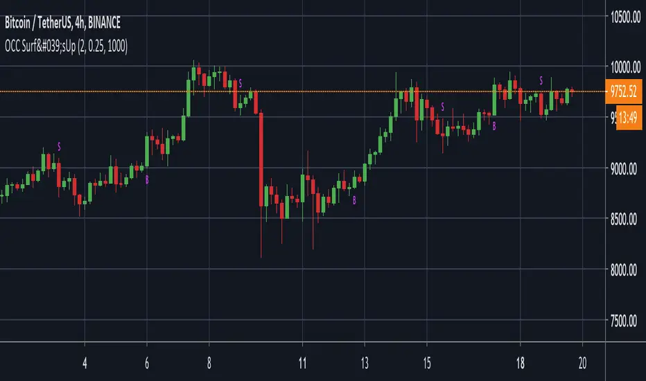 When added to the USD/ BTC 4H (optimal) charts of any high volume exchange, three new alert conditions will appear under the Surf's Up indicator alerts. Turn on the "Buy Signal" and "Sell Signal" to be alerted of potential large price increases. This script analyzes multiple data pieces to determine points in which the price has the highest probability of moving up, along with a sell alert that will alert the user of either: the point at which the trend is dying and to take profit OR that the trend is not happening, and to cut your losses. "Secure Profit" can be set to alert you of given profit target, at which time you can set a stop loss just above break even, essentially making a risk-free trade! This is OPTIONAL as it could cause you to a leave a large winning trade too early as well :)