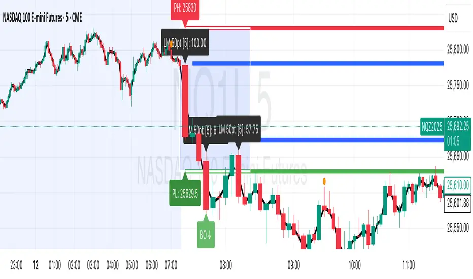A powerful multi-functional indicator designed for day traders and futures traders to identify session-based breakout opportunities, retest confirmations, and significant price movements across all futures contracts (Gold, E-mini S&P 500, Nasdaq, Crude Oil, and more).