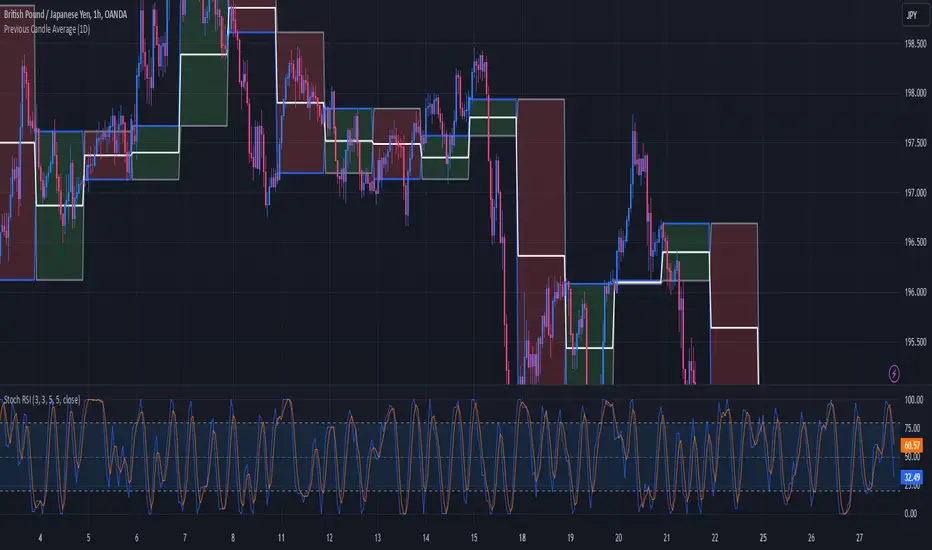 The Previous Candle Average indicator is a powerful tool designed to provide traders with insights into market momentum by visualizing the relationship between the current and previous open levels for a customizable timeframe. This versatile indicator allows you to select from various timeframes, including 1 Month, 1 Week, 1 Day, 8 Hours, 4 Hours, and 1 Hour, making it suitable for different trading strategies, whether you're a swing trader, day trader, or scalper.