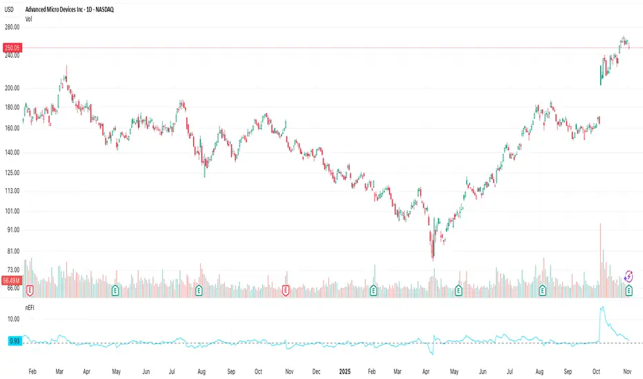 The Normalized EFI (nEFI) is a volume-weighted momentum oscillator that refines the classic Elder Force Index (EFI) by normalizing it against average trading volume. This makes it highly adaptable across different assets, timeframes, and market conditions—especially useful when comparing momentum strength between low- and high-volume instruments.