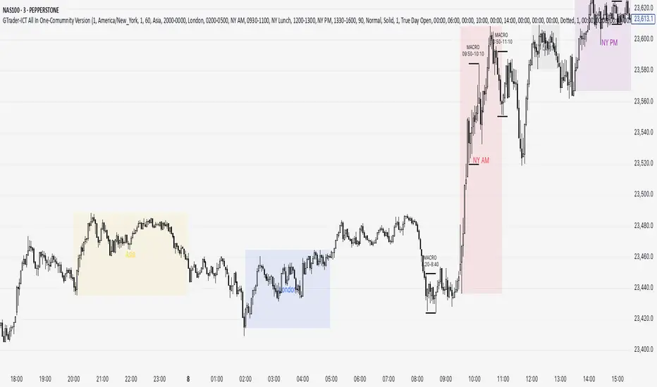 Meet the **GTrader-ICT All In One **, a comprehensive toolkit designed to integrate key Inner Circle Trader (ICT) concepts directly onto your chart. This powerful overlay indicator consolidates multiple essential tools, streamlining your technical analysis and helping you identify key temporal and price-based events.
