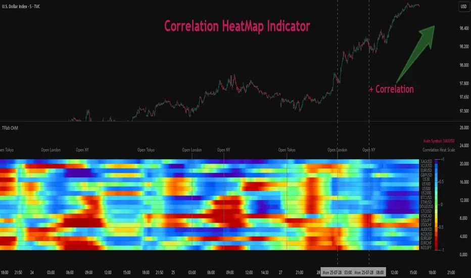 n financial markets, correlation describes the statistical relationship between the price movements of two assets and how they interact over time. It plays a key role in both trading and investing by helping analyze asset behavior, manage portfolio risk, and understand intermarket dynamics. The Correlation Heatmap is a visual tool that shows how the correlation between multiple assets and a central reference asset (the Main Symbol) changes over time.