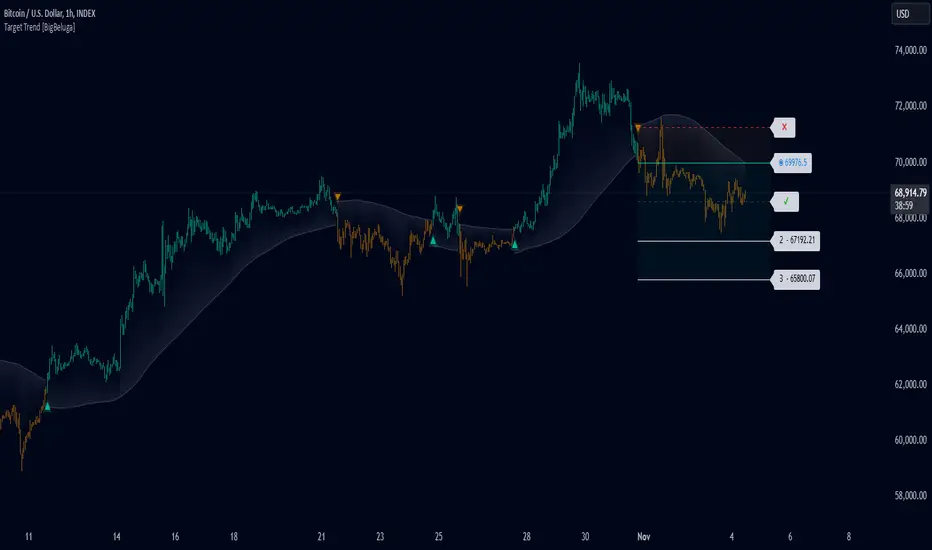 The Target Trend indicator is a trend-following tool designed to assist traders in capturing directional moves while managing entry, stop loss, and profit targets visually on the chart. Using adaptive SMA bands as the core trend detection method, this indicator dynamically identifies shifts in trend direction and provides structured exit points through customizable target levels.