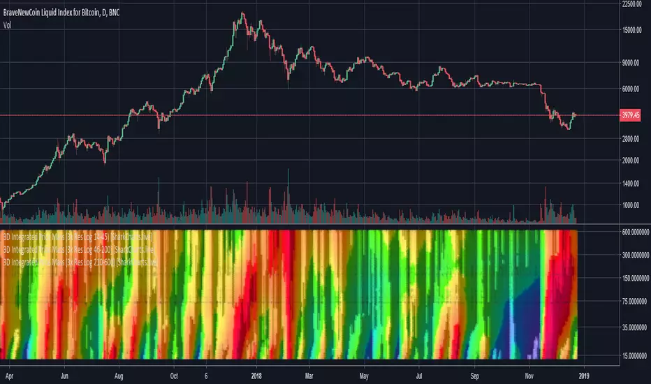 In 3D Integrated Price Mass, I took Mark Whistler's WAVE-PM indicator and first integrated the result by taking a running total of the period number then re-averaged it in order to make it range-bound. This means that a 14-period WAVE-PM is normal, but as the period number increases it increasingly becomes the average of periods below it. In theory, this should create a measurement for the "impulse" of the "force" of a volatility expansion. I plotted 32 period lengths from 14 to 600 at height equal to their length, reading out colors based on their value. I chose those lengths to create a relatively continuous indicator on log scale.