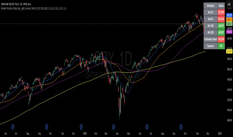 The Market Position Table is a comprehensive multi-timeframe indicator that provides traders with an instant visual snapshot of market position relative to key technical indicators. This tool displays a clean, color-coded table directly on your chart, showing whether price is above or below critical moving averages, the Ichimoku Cloud, and whether the market is in a TTM Squeeze compression.