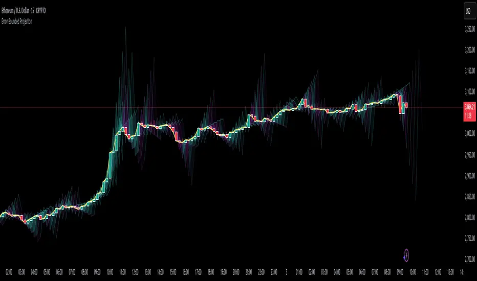 The idea here is to provide mobile S/R through Markov chaining. Definitely not a reversion to the mean trading system, or a trading system of any sort. More like an error bounded future price envelope that dramatically overshoots projected price in the direction it's moving in while just barely failing price bounding in the opposite direction. So in an uptrend, it'll overshoot the top while the bottom pokes out a bit and vice versa. Looks rather pretty. You'll have to adjust transparency settings. Happy hunting.