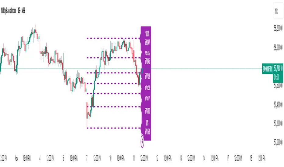 Once two confirmed swings are found, the script draws standard Fibonacci retracement levels (0%, 23.6%, 38.2%, 50%, 61.8%, 78.6%, 100%) between these anchors. The levels adapt to both uptrends and downtrends, based on swing position.