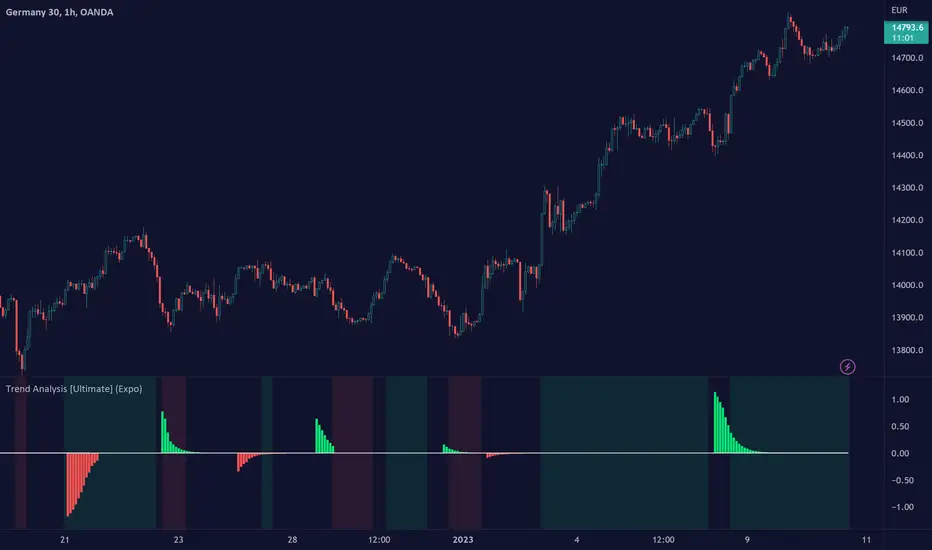 This Trend Analysis Indicator uses different calculations method, such as Fibonacci ratios, price retracements, cycles, and volatility measures, to calculate the trend characteristic. These values are used in an EWMA* function (similar to RMA). This function is used to smooth out the noise in data sets and to better identify cyclic patterns in the data. This function works by giving greater weight to more recent data points and less weight to older data points. This allows it to better identify and track trends in the data. The indicator is a valuable and useful tool for market analysis and can be used to evaluate the strength, direction, and characteristics of trends in a market.