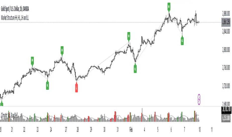 This indicator is designed to detect and visualize market structure shifts by identifying Higher Highs (HH), Higher Lows (HL), Lower Highs (LH), and Lower Lows (LL). It plots a ZigZag structure to mark trend changes, helping traders analyze price swings and market direction.