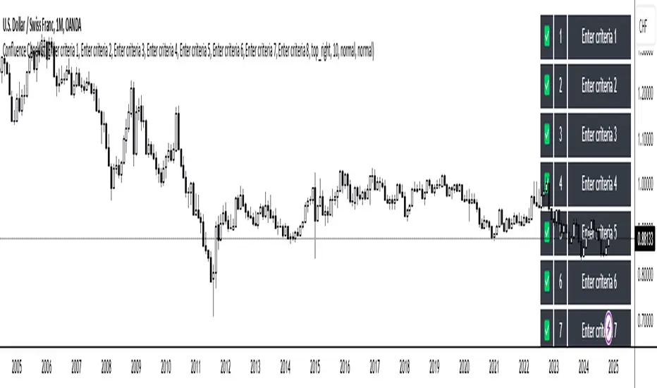 The "Confluence Checklist" indicator helps you to stick to your trading plan with your set rules. You have a total of 8 rules that can be set up manually. Using the checkbox, you can check during trading whether your rules are followed or not. You can change the colors of the table on the one hand, and the size and width of the table columns on the other.